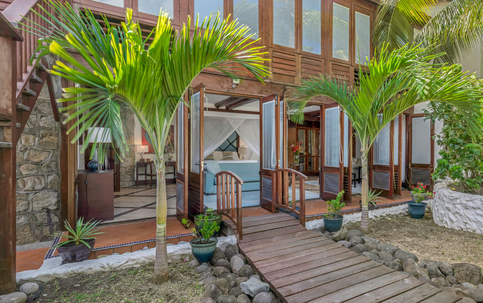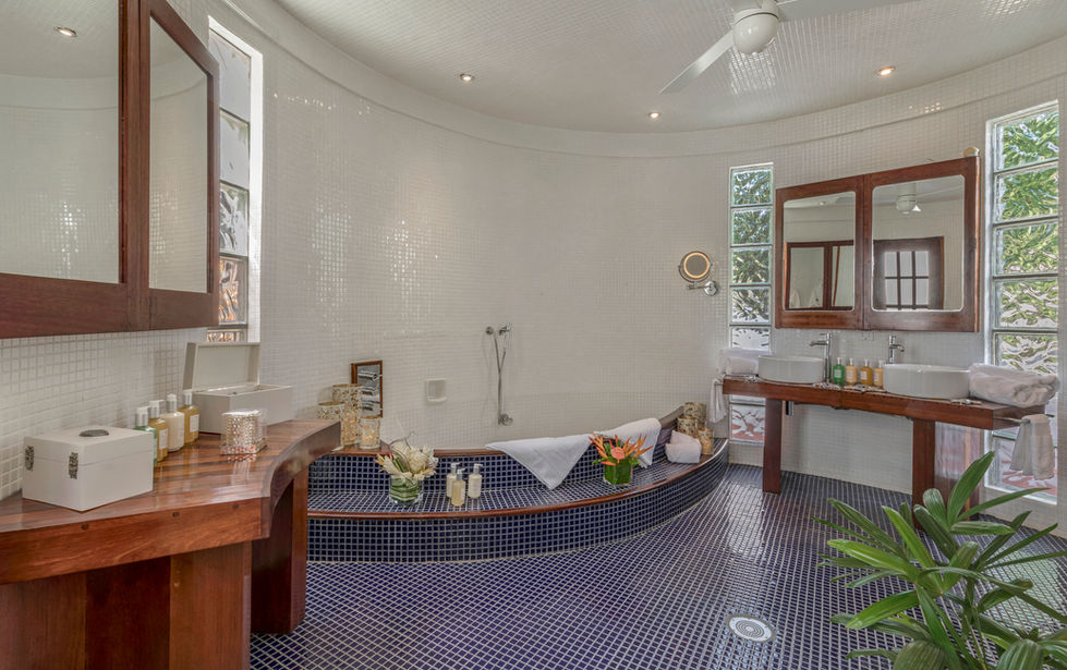 With its own private driveway and parking or walking down from the Main House past the large infinity pool and down on to the private beach you come to the 4 bedroom Beach House. Each spacious room has it own private entrance, and one of which opens up with direct access to the private Beach House swimming pool, whilst the other ground floor suite opens up onto a private garden. The rooms on the top floor are 1,200 square feet (120m2) in size, and the two on the ground floor are 900 square feet (90m2). Each of these bedrooms has a large en-suite bathroom and an additional outdoor shower for two. The Beach House has a full kitchen, outdoor Tiki kitchen and BBQ, an additional private laundry room, private deck and seating for 20 people comfortably. There is also a sitting room with doors that open up fully onto the beach and an additional half bath. In addition, each bedroom has a king sized pull-out sofa bed and additional beds can easily be placed in these rooms. # Can accommodate up to 12 people